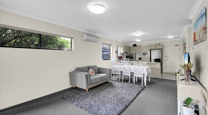 The apartment features premium contemporary appointments throughout, and the open-plan living/dining area flows onto a generous covered balcony + bonus courtyard that’s perfect for entertaining before you head out to the huge range of nearby restaurants and bars. You can also walk to shops, cafes and The Gabba, and there’s a bus stop around the corner for a quick ride into the CBD.