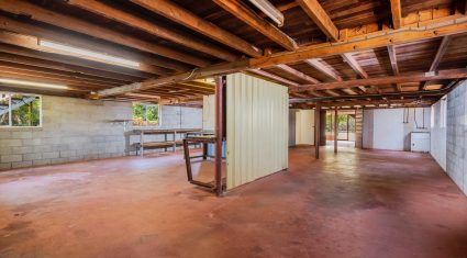 The lower level sports a man cave of epic proportions. With its own shower and toilet – it is perfect for cleaning up after a time of tinkering. A spacious undercover outdoor area is perfect to sling a hammock on a hot day. The garaging component can accommodate 2 vehicles tandem and there is also a storage/workshop area and separate room which has been utilised as an office.