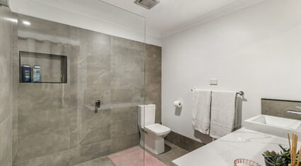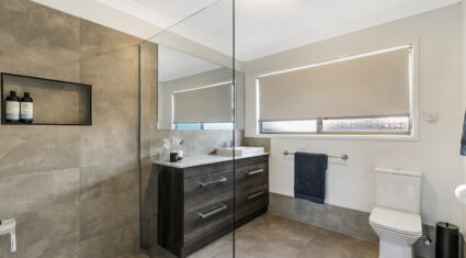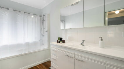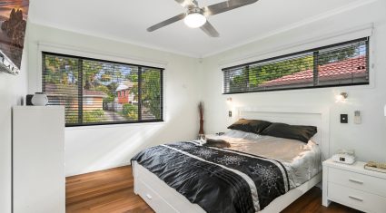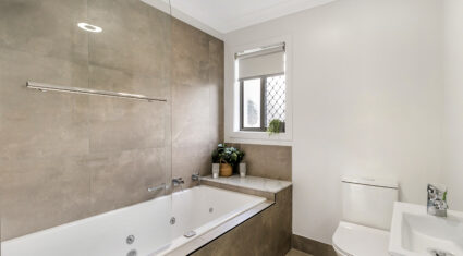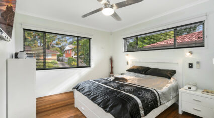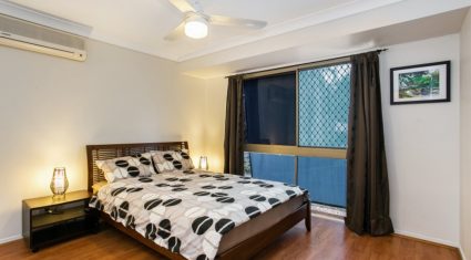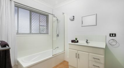 The airconditioned Master Bedroom offers a large walk-in robe, and spacious ensuite with a spa bath, shower, large vanity and toilet. The other two bedrooms have built-in robes and ceiling fans. The main bathroom features a single vanity, shower, bath and a recently added laundry for the convenience of not having to go downstairs each time you need to wash. There is also a separate toilet.