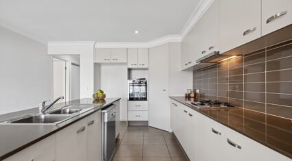 Sweeping benchtops, plenty of storage and stainless steel appliances are on offer in the kitchen which overlooks the large living and dining area. Walls of sliding doors draw you out to the balcony where you can kick back, relax, host guests and admire the space.