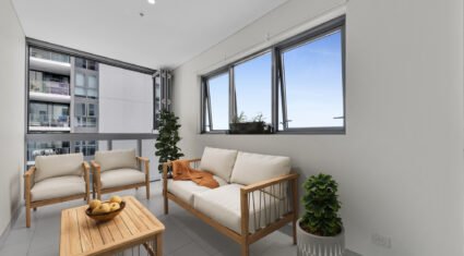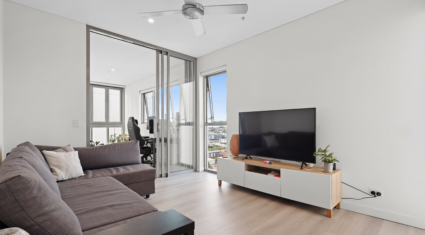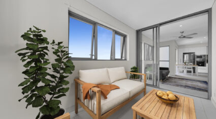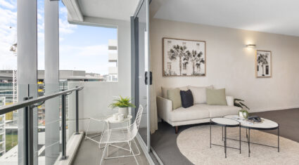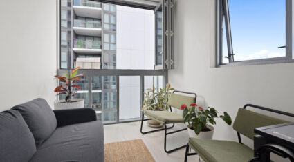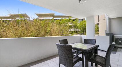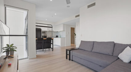 The open plan living and dining area lead to the balcony, providing a delightful space for meals, drinks, and relaxation overlooking Bowen Hills.