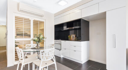 The kitchen showcases striking black cabinetry with abundant storage, including a pull-out pantry. It features a drawer-style dishwasher, under-bench oven, and an easy-to-clean electric cooktop. The split-system air conditioning ensures year-round comfort. Adjacent is the bedroom, adorned with plantation shutters that invite natural light from the living area.