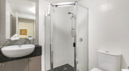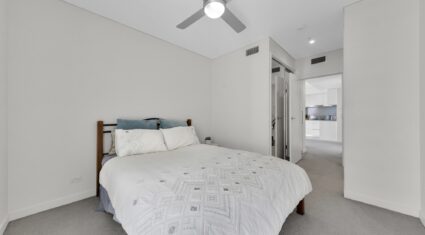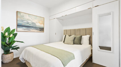 In the bedroom, a built-in wardrobe complements the bed, while the stylish bathroom boasts black and white floor-to-ceiling tiles. An extra-large shower, vanity with storage and bench space, and a cabinet with a wall mirror add to the appeal.