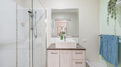 Three bedrooms are perched on this level, all with easy access to the laundry and the three-way bathroom with a separate bath, shower toilet and vanity.