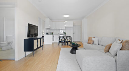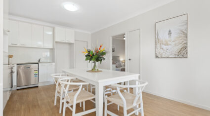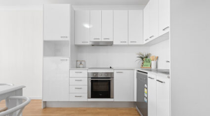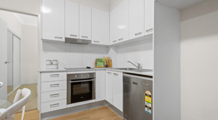 Step inside to discover an open living and dining area with air-conditioning and seamless access to the balcony—perfect for relaxing or entertaining. The kitchen is sleek and streamlined, complete with stainless steel appliances, electric cooktop and oven, and ample cabinetry.
