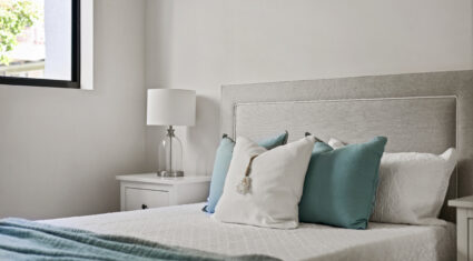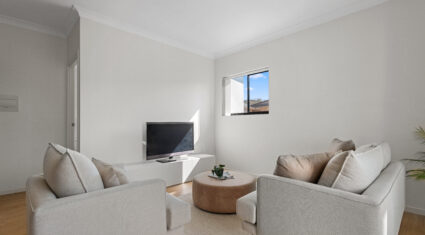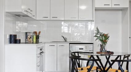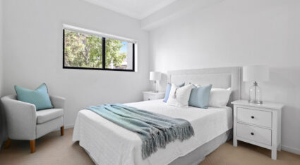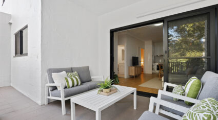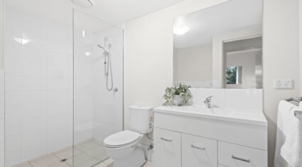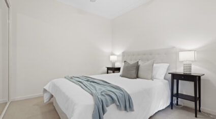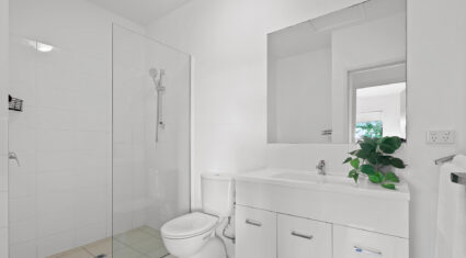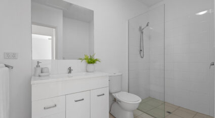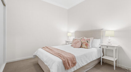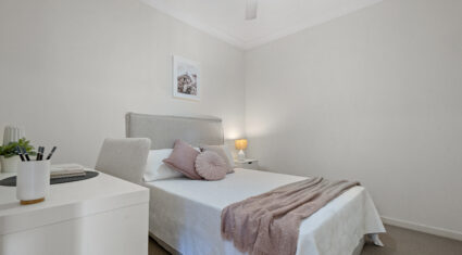 Both bedrooms feature built-in wardrobes and ceiling fans. The central bathroom includes an oversized shower and a clever European-style laundry, maximising every bit of space.